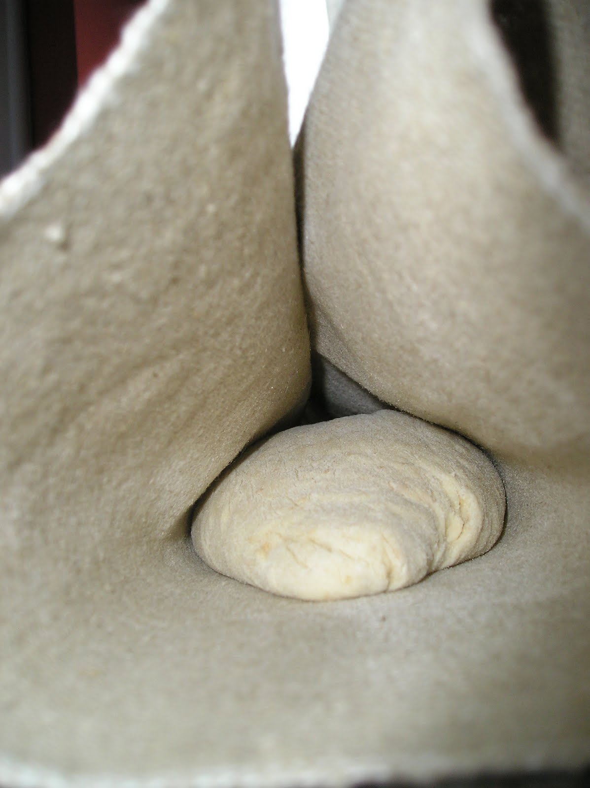 Colocar en una couche de lino o en un trapo de algodón viejo bien enharinado. Mantener los laterales doblados y bastante juntos para que el pan crezca hacia arriba. Pueden colocarse soportes laterales, además de cerrar el paño plegado con pinzas o sujetapapeles (son muy útiles).