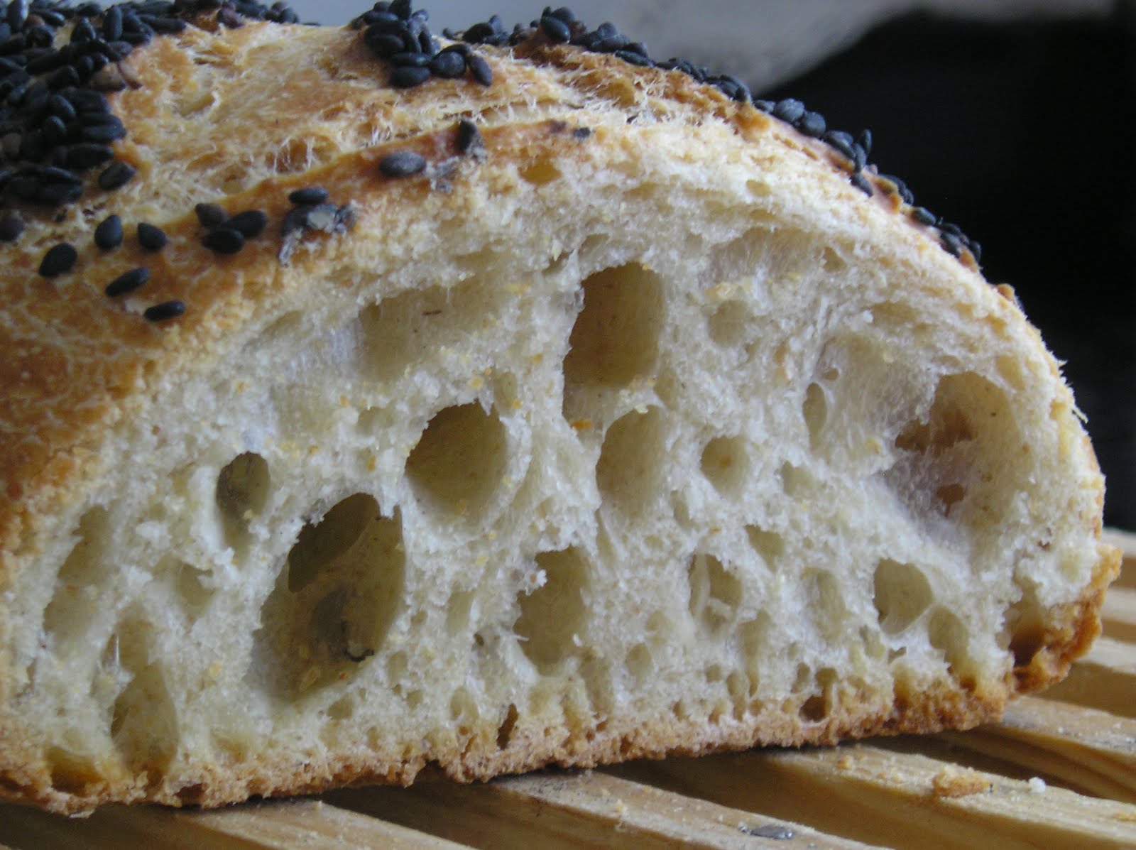 Hornear 15 minutos a máxima temperatura, y 30 minutos a 210º. Sacar del horno, enfriar en una rejilla y … a disfrutar.A la izquierda, la miga del pan ahusado. A la derecha la miga del pan con semillas de sésamo. Dos pedazos de pan, dos her(p)anos: una auténtica delicia de miga.