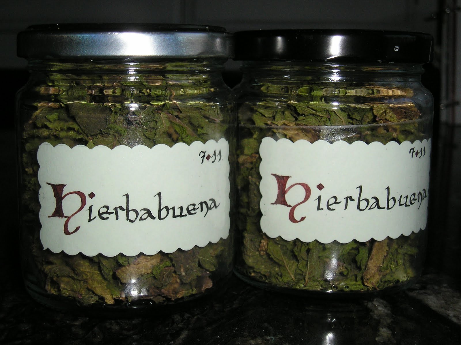 Para el secado de las hiernas, en verano me basta colocarlas recién cortadas en una bandeja y dejarlas un par de días a oscuras en un lugar cálido (cualquiera de exterior). En mi casa, un armario hecho bajo la escalera de acceso a la azotea es el sito perfecto: oscuro, ventilado y cálido. Después del secado inicial, separo hojas y ramitas, desechando estas últimas. Y vuelvo a dejar secar las hierbas otro par de días. Luego las envaso y etiqueto. Con unos folios de color, una tijera de borde dentado, plumilla, tinta y algo de paciencia pueden hacerse unos bellísimos rótulos. Yo estoy comenzando a practicar la caligrafía y uno de mis ejercicios son las etiquetas para mermeladas y especias.