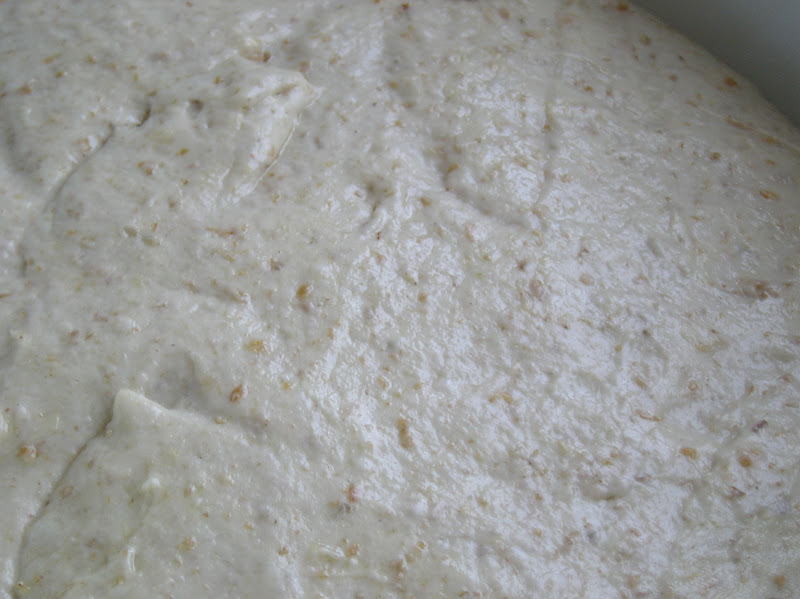 Dejar fermentar hasta que doble su tamaño. A 28º (verano) fermentó durante 4 horas. Pueden hacerse dos plegados para que adquiera algo más de fuerza y cuerpo. Para ello, dividimos mentalmente la masa sin sacarla del cuenco en cuatro partes (como los puntos cardinales). Tomamos la masa suavemente de cada punto cardinal sucesivamente y la llevamos al centro. Y al final giramos la masa sobre sí misma para que el punto en el que hemos colocado las esquinas dobladas quede debajo y no encima. Podemos hacer el primer doblado al cabo de 90 minutos y el segundo una hora después, más o menos.