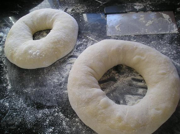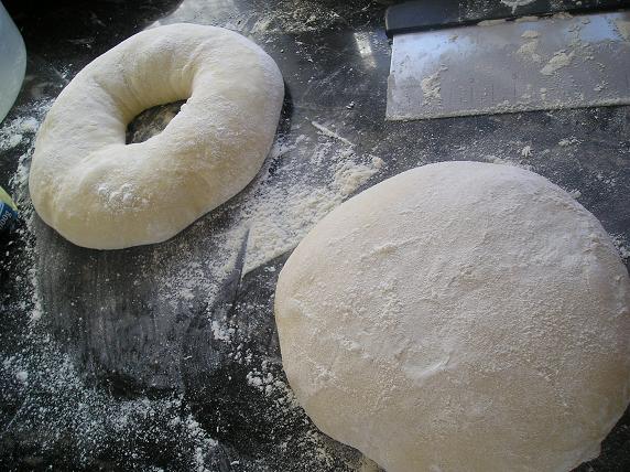 A partir de ese agujero ir estirando la masa, manteniendo el grosor uniforme en todo el “aro”. SI la masa se resiste a ser estirada, darle reposos para que el gluten se relaje. La harina de fuerza demostrará todo su carácter haciéndonos este paso algo más difícil y lento. Es cuestión de paciencia para no desgarrar la masa con tirones apresurados.