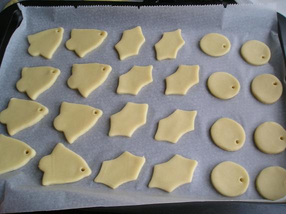 Ir colocando las galletas cortadas en bandejas cubiertas de papel de hornear. Si se quieren luego colgar las galletas del árbol de Navidad, hacerles un agujero con un palillo. El agujero debe ser amplio (para pasar luego la cinta), debiendo tener en cuenta que con el calor del horno la galleta se dilata y el agujero queda siempre algo menor.
