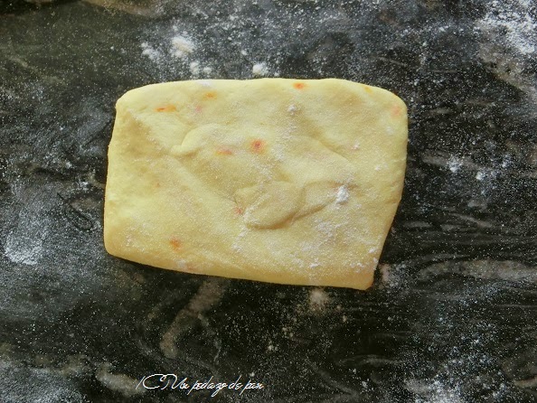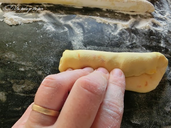 Primera fase del formado. Aplastar cada trozo formando un rectángulo. La encimera debe tener muy poca harina, o la masa no sellará bien en esta primera fase del formado. Plegamos el lado largo sobre sí mismo, enrollando la masa. Bastará tres pliegues y un buen sellado. Tendrá forma de un cigarro grueso y corto, de unos 10 centímetros. Enharinarlo y dejar reposar, mientrar se forman cada uno de los trozos de masa restantes.