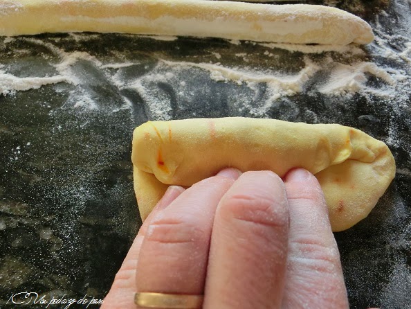 Tendrá casi 30 centímetros. La enharinamos y dejamos reposar, mientras formamos los demás pedazos de masa. Irá encogiendo hasta quedar del tamaño aproximado de un buen espárrago (unos 24 centímetros y casi 2 centímetros de diámetro). Dejar reposar mientras estiramos cada uno de los demás pedazos.