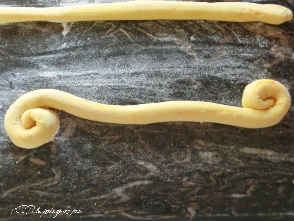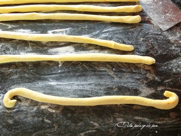 Los bollos tienen forma de S invertida. El giro es en sentido contrario al reloj. Para formar cada bollo hay que estirar la masa hasta obtener una cuerda de 40 centímetros como mínimo. Es prácticamente imposible formar un bollo de un sólo paso, porque la masas pierde relajación al manipularla y se vuelve tenaz y se nos encoge cuando intentamos estirarla. Por ello, describiré pormenorizadamente las cuatro fases del formado: debe repetirse cada fase con todos los trozos de masa antes de comenzar el siguiente paso, dejando descansar cada pedazo de masa mientras se trabaja con los demás pedazos.