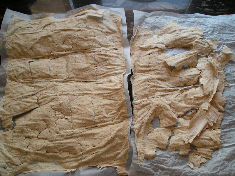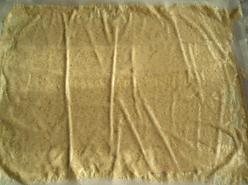 En principio, para secar la MM tan sólo es necesario extender MM sobre una hoja de papel de hornear hasta que quede muy fina, casi traslúcida. Cuanto más fina, más rápido se secará y mayor garantía tendremos de que se seca perfectamente antes de guardarla. En esta foto, MM de centeno extendida sobre papel de hornear para secar.