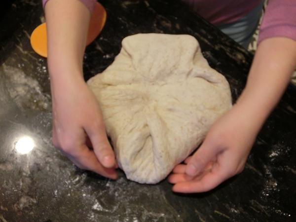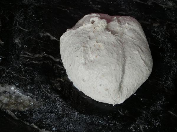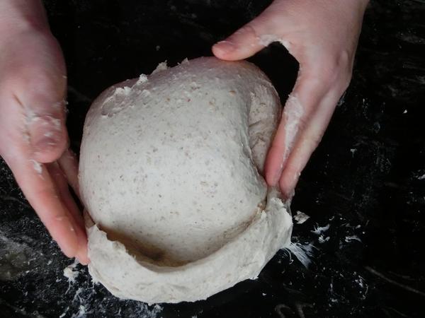 Formamos en bola con tensión, arrastrando la masa sobre la encimera sin enharinar, sin dejarla girar sobre sí misma, sino provocando un estiramiento superficial continuo.