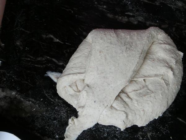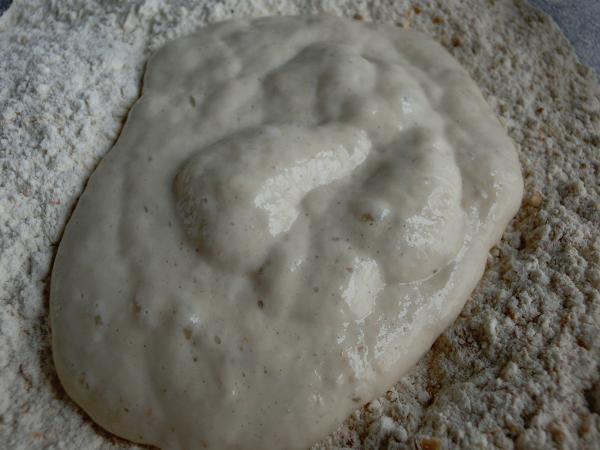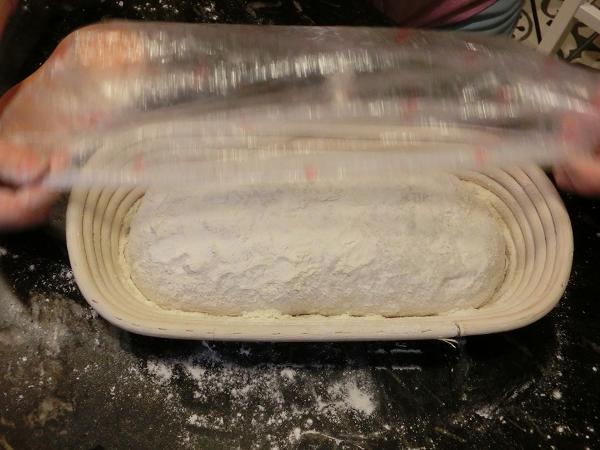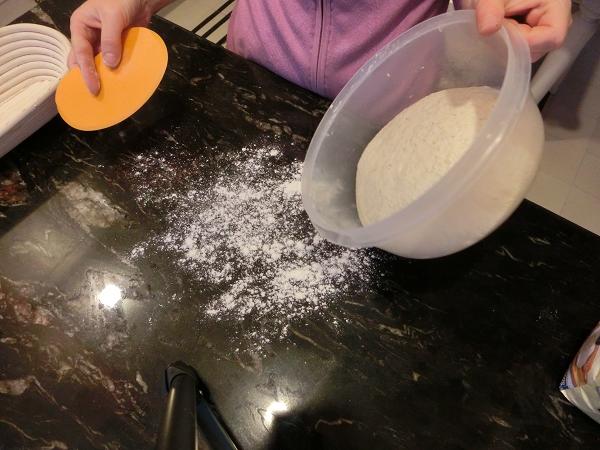 Espolvorear harina por encima, para que absorba el aceite restante que tenga la superficie. Si no lo hacemos, al formar el pan se producirán “hojas” de masa envueltas en grasa (efecto hojaldrado) que hará que el pan quede con capas internas. Si se abre salvájemente en el horno, se abrirá por esas capas.