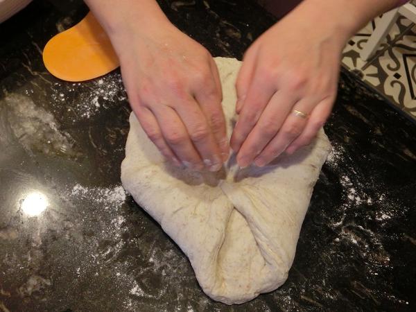 A continuación, plegamos la masa sobre sí misma y sellamos muy bien el doblez con las puntas de los dedos o el canto de la mano.