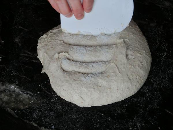 Con la rasqueta, hundirla en la masa como si hiciéramos un enrejado. Con ello la repartimos, le ayudamos a integrarse y a que al empezar a amasar después, no salga disparada por los aires o por la encimera.