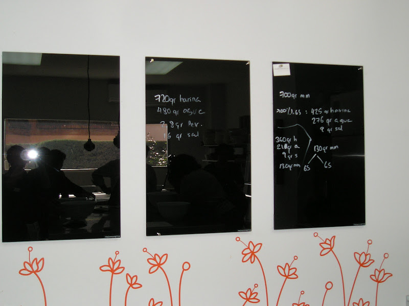 sobre el porcentaje del panadero, cómo “montar” tu receta, cómo convertirla (con sin MM/levadura, con prefermentos…) en su famosa y especial pizarra de cristal