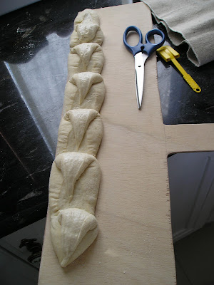 Os dejo los cortes de la baguete cola de dragón. En este video de youtube es donde encontré la idea. Los cortes se hacen justo antes de llevar la baguete al horno, cuando ya ha fermentado completamente, para evitar que se abran los cortes.