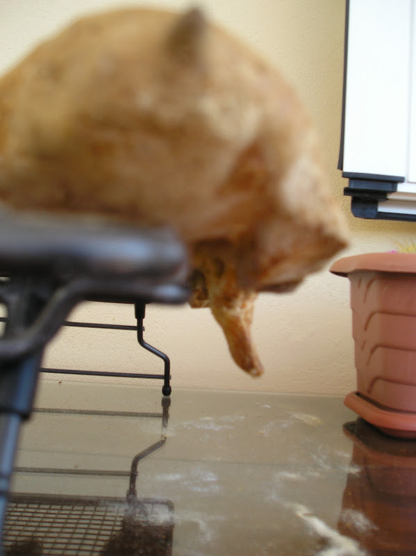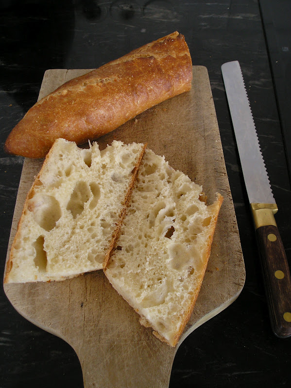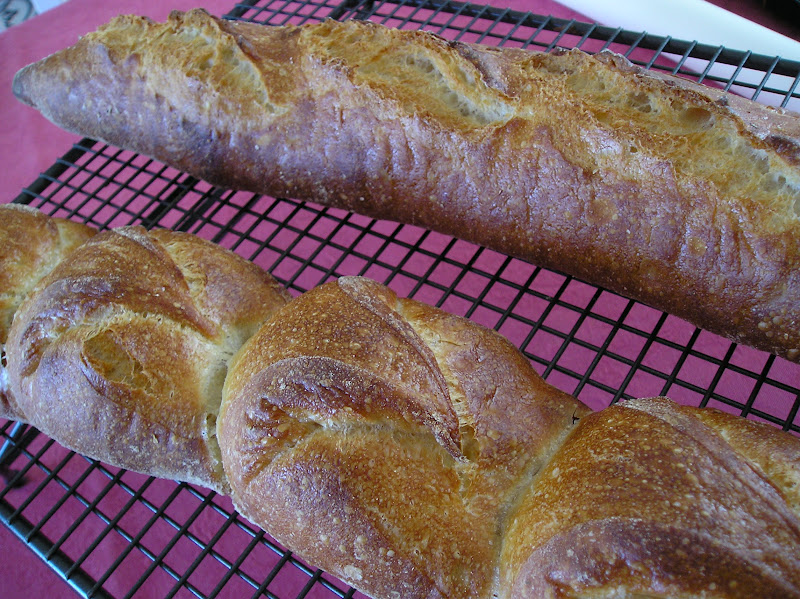Yo no tenía piedras volcánicas y siempre había recurrido a añadir agua hirviendo a la bandejita que tengo en la solera del horno. Así que decidí incluir la opción de ventilación forzada. Y me equivoqué. Al menos en este primer intento sólo logré que nuestras baguetes -las del Pepo y las mías- terminaran siendo hogazas de pan rústico en forma de baguete: vaya, que tenía una corteza gruesa y oscura. Nada parecido a esa corteza crujiente que se agrieta, fina y que hace ruido de las baguetes de nuestros sueños. En fin, otra variante: la baguete de Al-P-Andalus es así (digo yo).