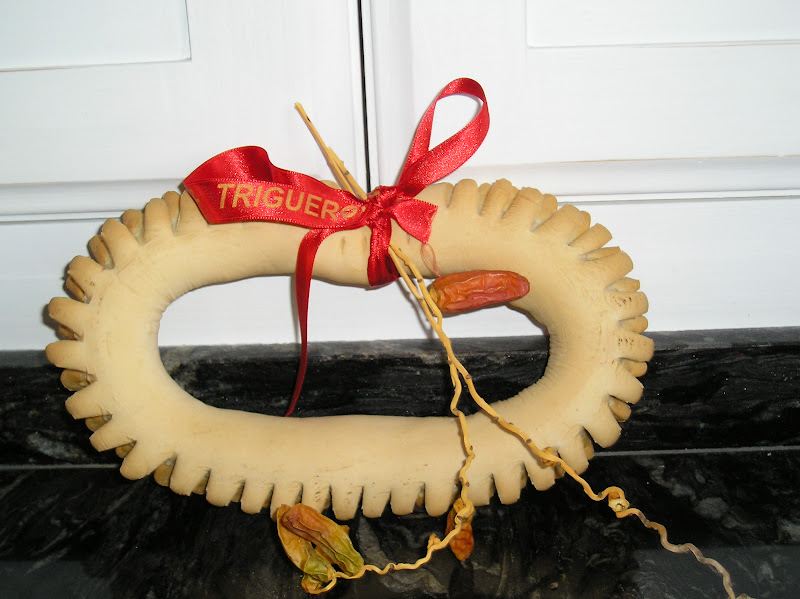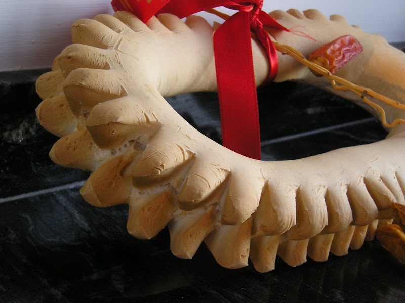 Bueno, y este curioso detalle panadero: se trata de una rosca votiva a San Antonio Abad, que nos trajeron Pepo y Libertad de Trigueros (Huelva), donde el santo es patrono. Nos cuentan que antiguamente estas roscas se comían, hoy son un recuerdo. Hechas de masa prieta se adornan con dátiles, imagen de la prosperidad.