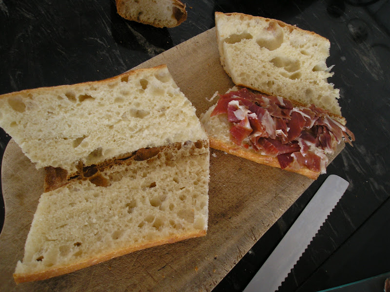 En total, tres baguetes de 325 gr. cada una que desaparecieron en la comida… en fin, salvo un par de pedazos que acabaron devorados en la merienda con un buen relleno de jamón ibérico.