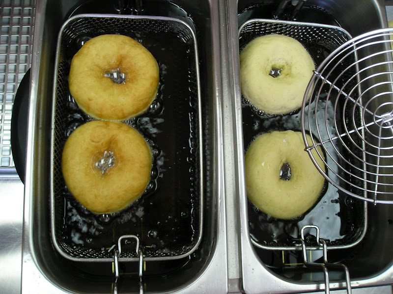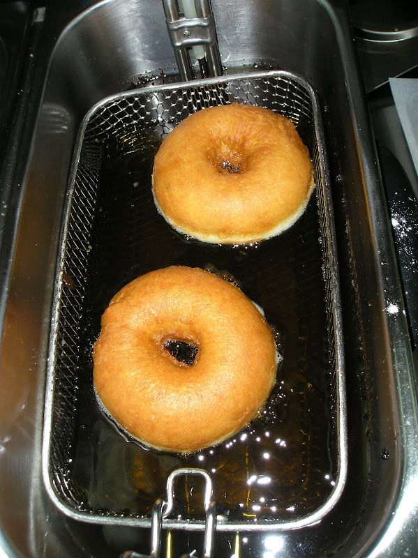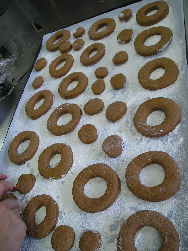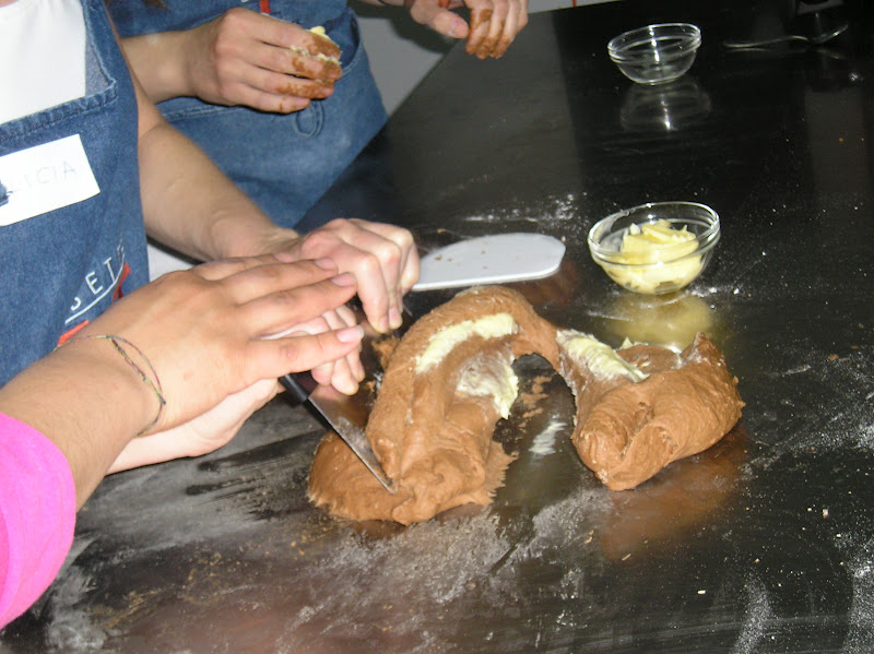 La mañana cundió mucho: hicimos tres tipos de donuts, dos de ellos de masa fermentada (de panadero) y una de masa abizcochada.Tuvimos, claro, que lidiar con el amasado y la incorporación de la mantequilla tanto para una masa blanca y otra de chocolate, ambas con una roma a vainilla delicioso.