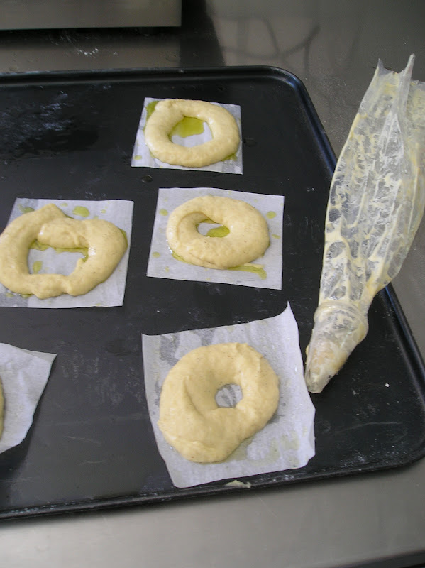 Por último, preparamos la receta de los donuts abizcochados, que hay que formar con manga pastelera sobre papel engrasado. Entre que no encontrábamos la boquilla adecuada y la falta de habilidad de alguna participante -y sin señalar, creo que mis donuts tenían cualquier forma menos la circular- estos donuts no quedaron tan bonitos (pero vaya, muy, pero que muy ricos. De eso se trataba, ¿no?).