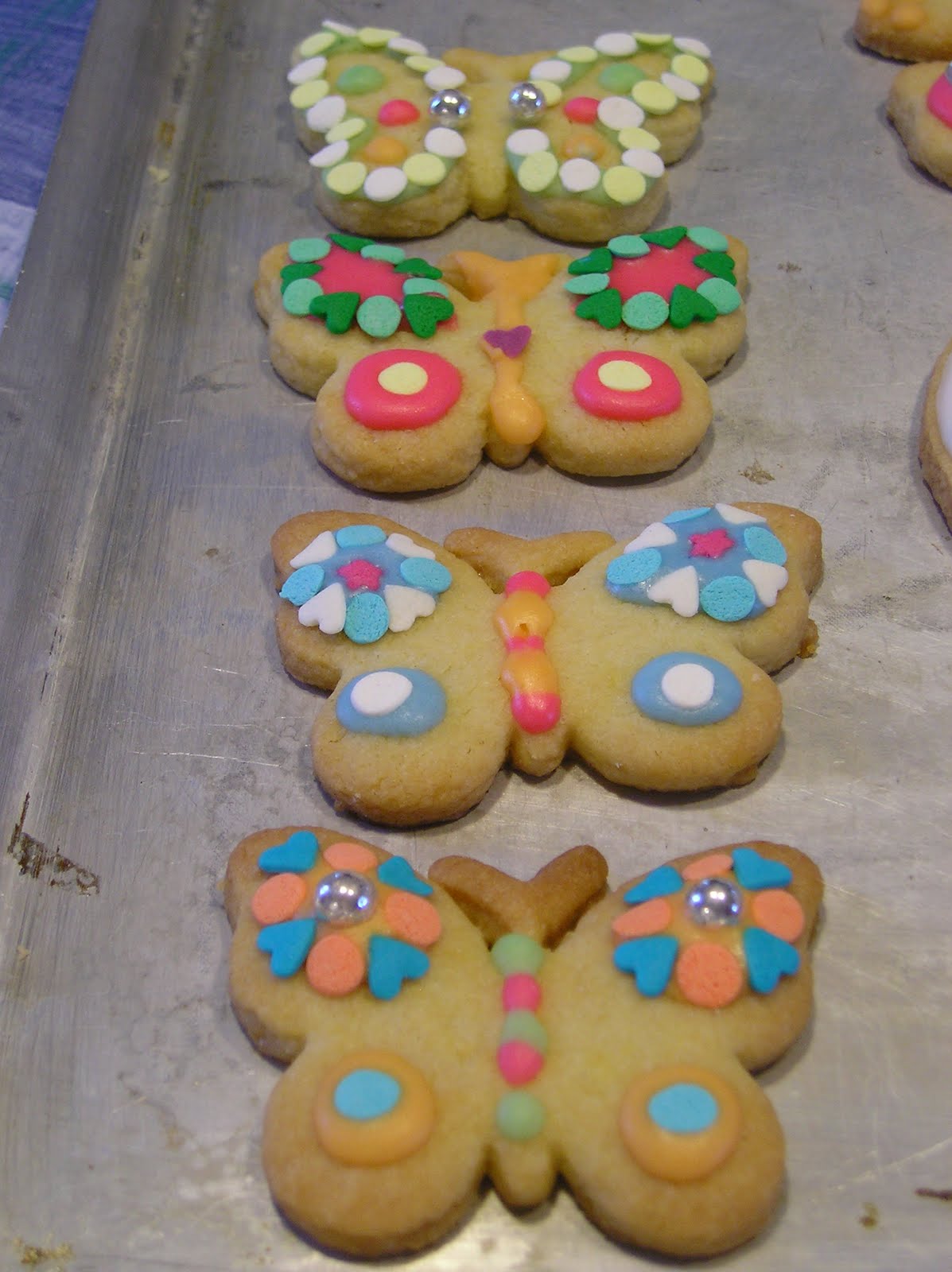 Hemos incorporado el uso de adornos de caramelo: perlas, corazones, círculos, estrellas. El efecto es espectacular, bien dosificados, como por ejemplo las cenefas de los bordes de algunos huevos de Pascua (como en la foto del principio) o las alas de las mariposas, como veis en esta foto de detalle.