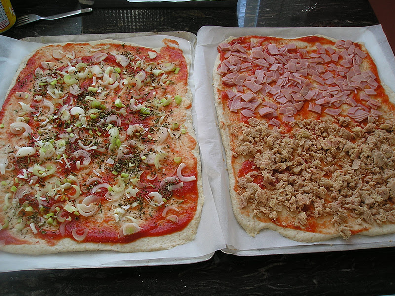Tocaban pizzas… y cada vez las tengo que hacer mayores. La capacidad máxima del horno para cocer simultáneamente las pizzas son dos bandejas de 25×35 cms. cada pizza de tal tamaño necesita 350 gr. de masa, estirada para que quede fina.