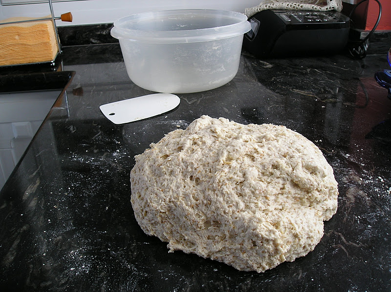 Mezclar las harinas en un cuenco. Añadir la sal y la masa vieja troceada. Añadir el agua y la levadura. Dejar reposar 15 minutos. Mezclar todo bien. Este es el aspecto de la masa al volcarlo sobre la encimera.