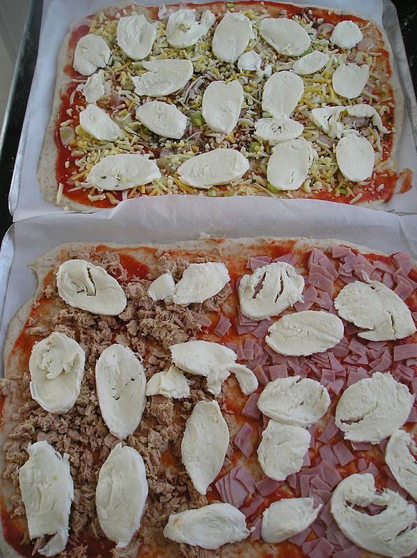Extendar las bases de pizzas en bandejas forradas de papel de horno. Rellenar y cubrir de queso.Hornear con temperatura muy alta. Para ello habrá que calentarlo mucho tiempo al máximo. Al final del horneado de la pizzas, quitar las bandejas y dejarlas sobre el papel de hornear, en contacto con la piedra del horno, para que la base quede tostada.