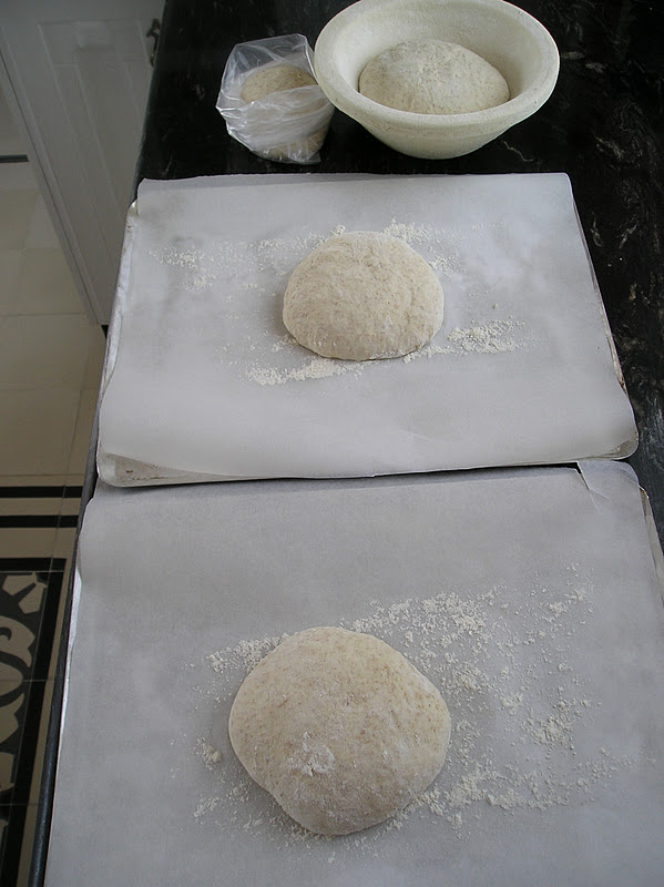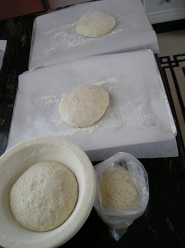Dejar reposar la masa al menos 3 horas a temperatura ambiente. Según la temperatura puede hacer falta algo más de tiempo. Sacar del cuenco y desagasificar suavemente la masa. Dividirla en cuatro pedazos: dos de 350 gr. para las pizzas, 1 de 250 gr. para guardar como masa vieja (en la foto, en una bolsa), y el pedazo restante de unos 550 gramos, para una pequeña “boule” u hogaza redonda.