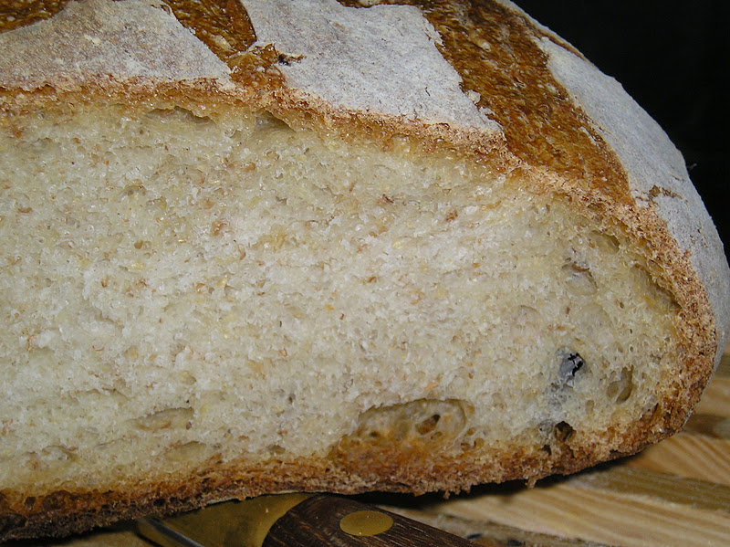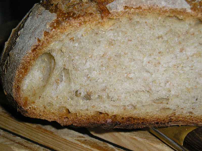 Así que decidí aprovechar que el horno estaba encendido para añadir un poco más de harina que de ordinario y hacer un pequeño pan para completar la hornada (550 gr. de masa en crudo, 475 gr. ya cocido). Y claro, el pedacito de masa de 250 gr. para guardar como masa vieja para el próximo horneado. Todo de un solo amasado.