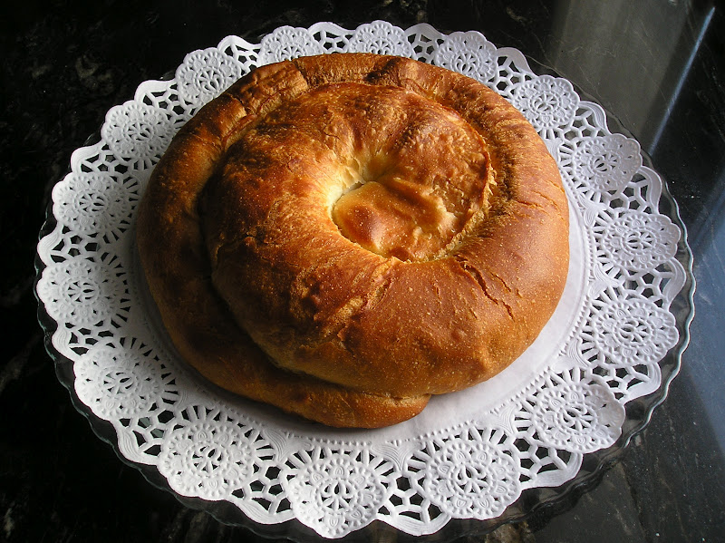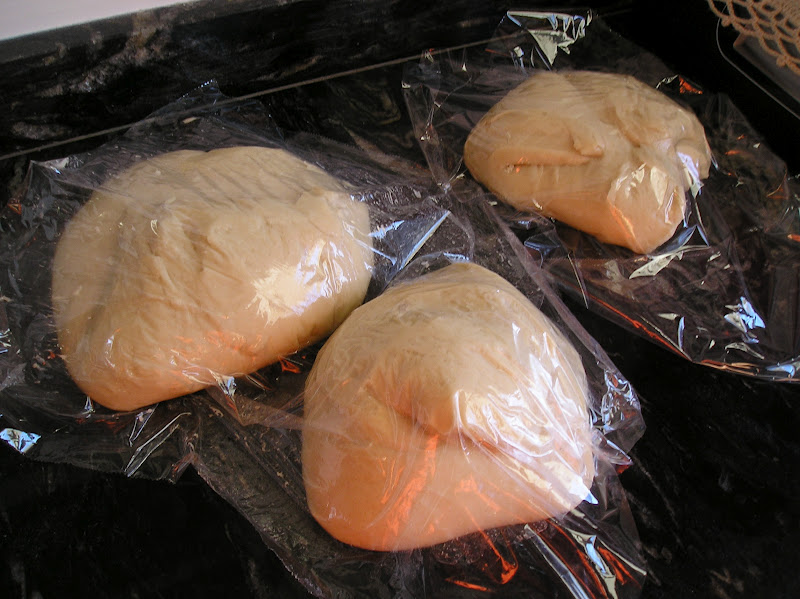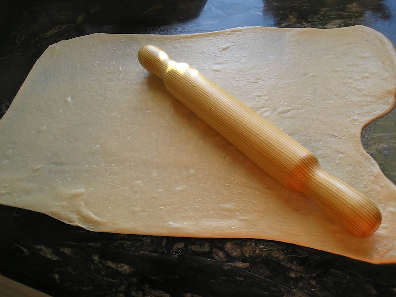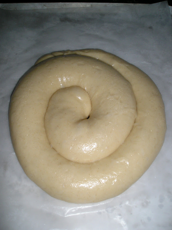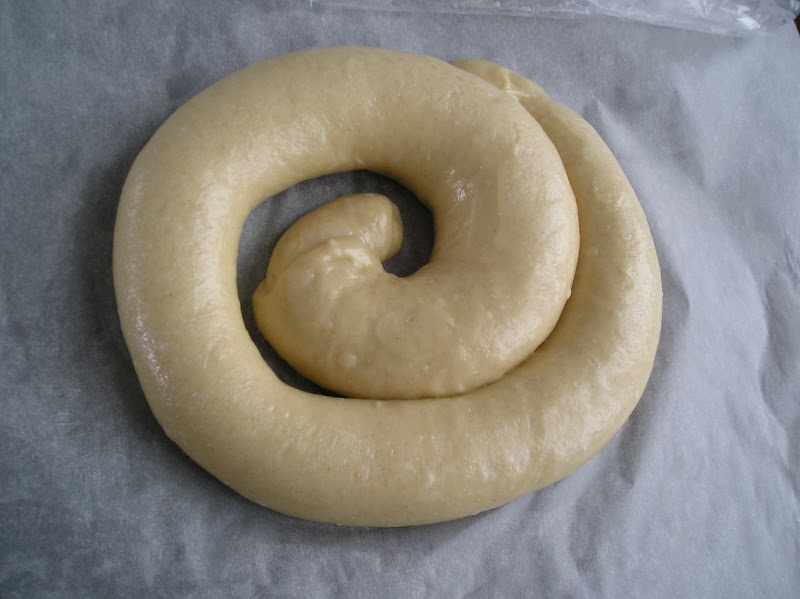 Se deja reposar para poder estirar un poco más el rollo de masa. Pueden irse formando así sucesivamente las demás porciones de masa. Luego, sobre una placa de horno recubierta de papel de hornear se forma una espiral en el sentido de las agujas del reloj. Se cubre con film transparente engrasado (con manteca de cerdo o aceite de oliva) y se deja fermentar de 12 a 48 horas, según la temperatura. En mi cocina a 22º estuvieron 12 horas.