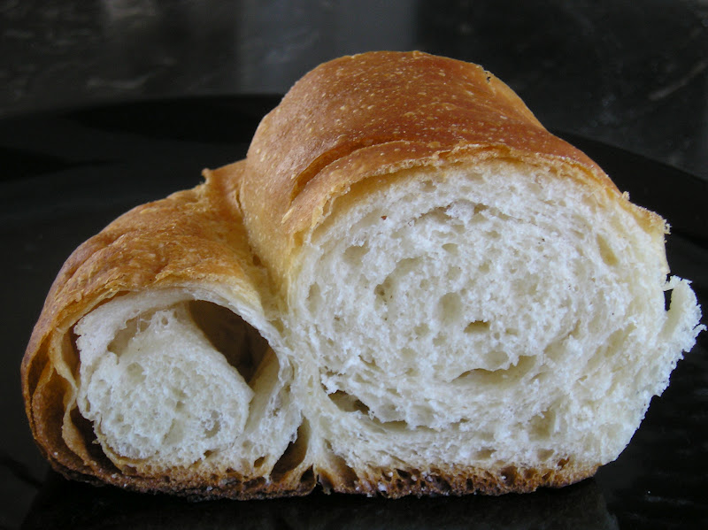 El problema -o la ventaja comparativa, según se mire- es que yo nunca he comido una auténtica ensaimada, por lo que no puedo comparar realmente el resultado. Y desde luego, comparada con las piezas que se compran en supermercado y pastelerías esto es otra cosa (amos que son “ligas” distintas). Mi costilla, que sí conoce las auténticas ensaimadas me dice que no se parece el resultado a lo que él recuerda. Creo que le ha faltado manteca entre cada capa del laminado, porque el interior ha quedado así.