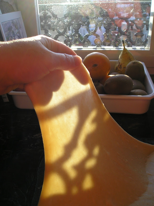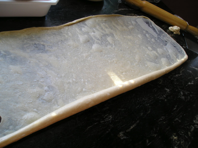 Una vez bien estirada la masa, hay que pincelarla con manteca de cerdo. Yo tomé la manteca entre las manos, y la froté suavemente sobre la superficie de la masa con las manos. Creo que aquí es donde pequé por defecto: debía haber puesto más manteca en la superficie de la masa antes de enrollarla.