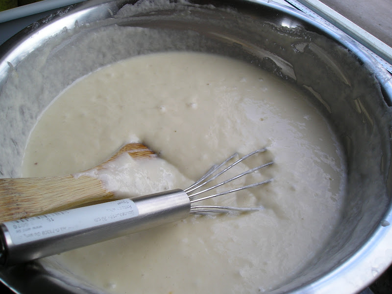 En un cuenco grande mezclar la MM, los 25 gr. iniciales de azúcar, los yogures y la harina. Batir, cubrir con film y dejar reposar toda la noche en nevera o, fuera de ella, al menos 6 horas.