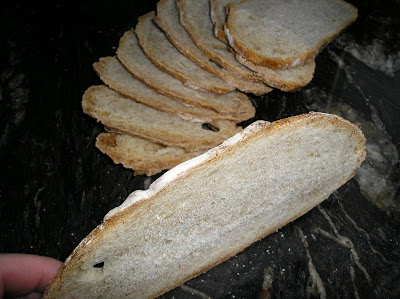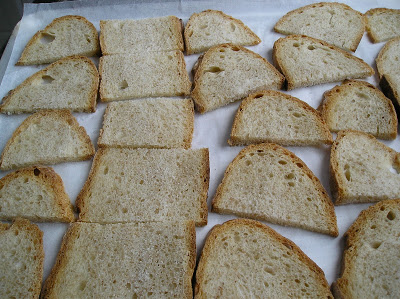 Lo primero es cortar el pan en rodajas muy finas: es sencillo si cuentas con una buena tabla (yo tengo una sólo para pan y otra para el resto de la cocina) y un buen cuchillo panadero.