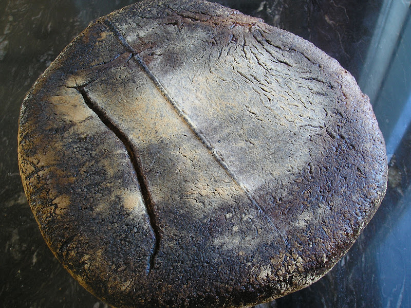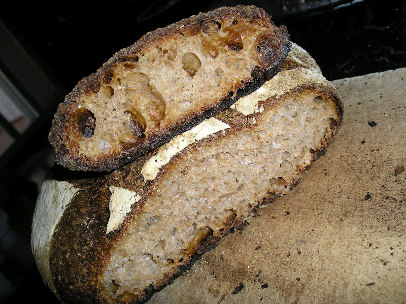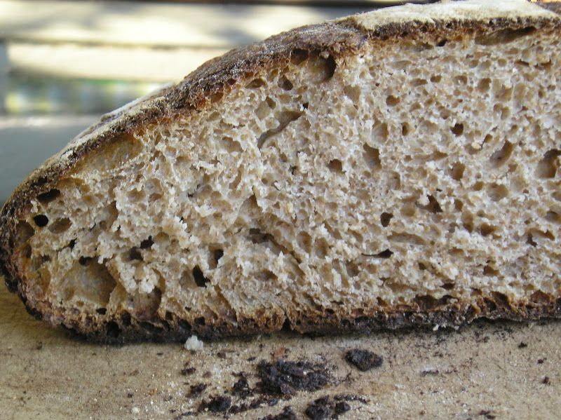 Y en segundo lugar porque la tasa de hidratación del pan de Reinhart me parecía escasa. Yo pequé por exceso, y al pan le costó mantenerse airoso una vez que lo liberé del banetón para ir al horno. Por eso, el resultado ha sido un pan poco voluminoso, pero con una miga auténtica de pan de masa madre (bien gelatinizada), con buenos alveolos, una humedad en la boca maravillosa y un sabor a cereal y frutos secos.