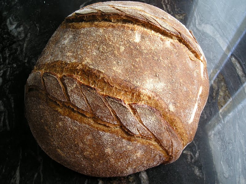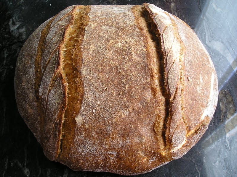 Calentar el horno a 250º mientras el pan fermenta. Cuando esté a punto, volcar sobre una pala o bandeja y llevar al horno con vapor. Hornear 10 minutos a máxima potencia. Bajar luego la temperatura a 210º y hornear 45 minutos más, hasta que el pan esté bien tostado, para que desarrolle una buena corteza gruesa.