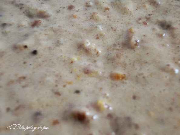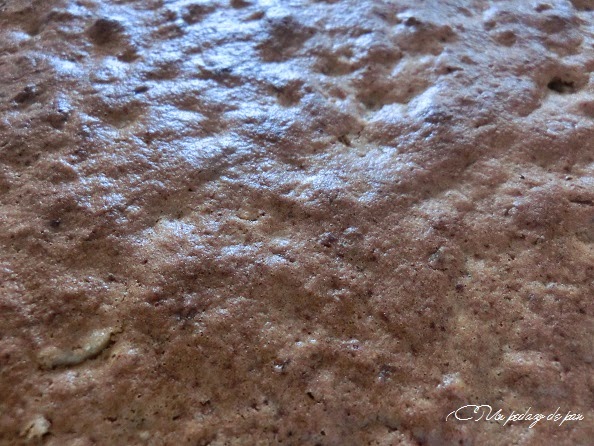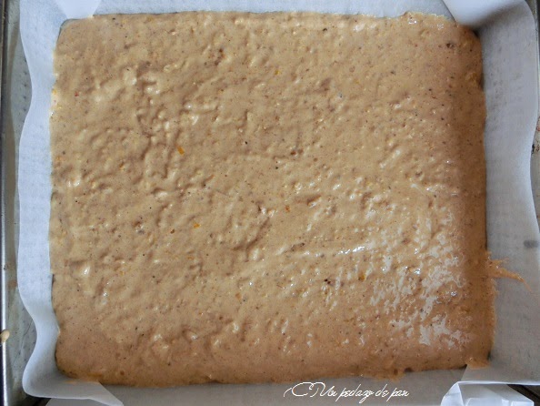 Verter en un molde de poca altura, de 30×24 cms. encamisado con papel de hornear, para hacer un plancha que antes de cocer tendrá dos dedos de altura y después de hornear doblará la altura.