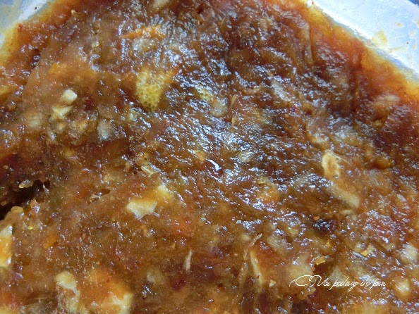 La víspera previa a preparar el pastel, picar con la ayuda de un robot o en la thermomix los dátiles, las pasas, el limón y la mandarían (ecológicos si es posible, porque se usa toda la pieza, incluida la piel). Si no gustan los matices amargos, puede pelarse el limón y la mandarína y utilizar el interior y sólo la parte externa de la corteza, evitando la piel blanca (que es la parte amarga).