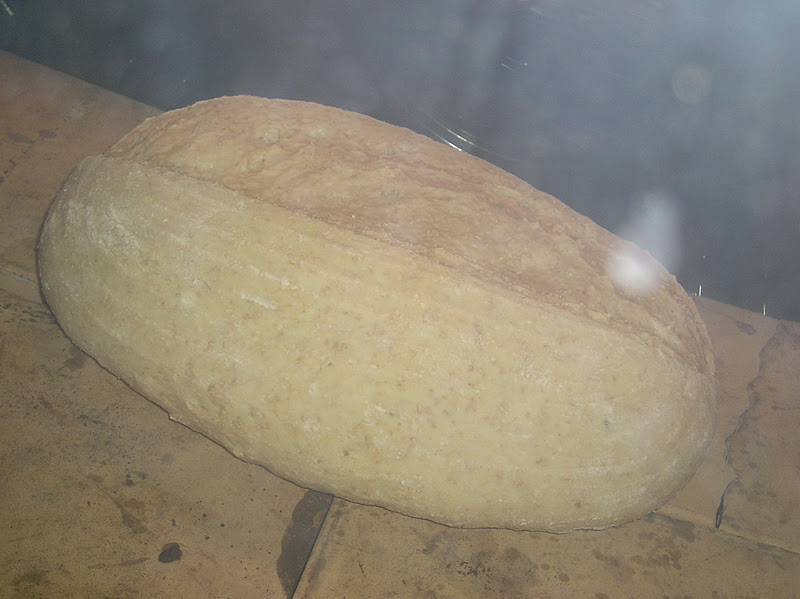 Antes de hornear, greñar con un corte muy profundo, longitudinal. Llevar al horno a máxima potencia, sobre piedra si es posible y con vapor. Al cabo de 15 minutos, bajar la temperatura a 210º y hornear 35-40 minutos más. Debe tostarse muy bien para tener una corteza gruesa y crujiente.