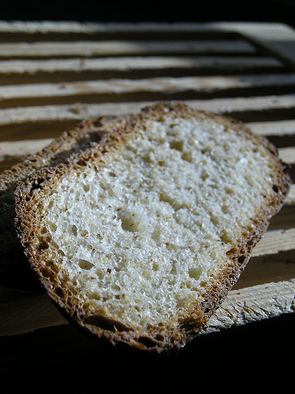 Entretanto y para volver después de tanto dulce y pan de molde a lo saludable, comienzo por introducir de nuevo este pan al 50% de harina integral. Lleva una hidratación del 70%, de la que una parte (40%) es zumo de naranja. El efecto sobre la harina integral es doble: de un lado reduce el ligero amargor de los panes muy integrales; de otro lado, actúa como mejorante panario (para eso contine Vitamina C, ácido ascórbico) y ayuda a que la masa sea menos densa. Si alguien tiene curiosidad, puede pasear por entradas antiguas en las que experimentaba con el zumo de naranja: La Feria de la Ciencia o Ciencia-cional, son dos ejemplos.