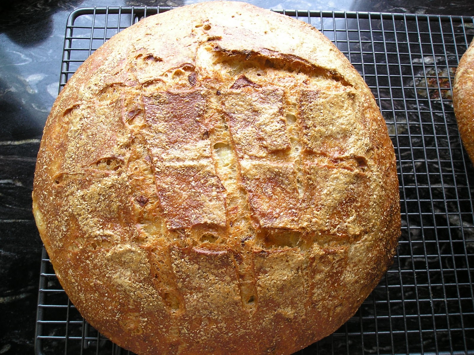 Tras calentar el horno al máximo (250º), voltée el pan, lo rocié con un pulverizador y le hice un corte en damero. Añadí agua hirviendo a la bandeja que vive permanentemente en el horno, debajo de las piedras refractarias. A los 15 minutos bajé la temperatura a 220º y al cabo de 30 minutos a 200º. El pan estuvo en el horno 50 minutos de reloj.