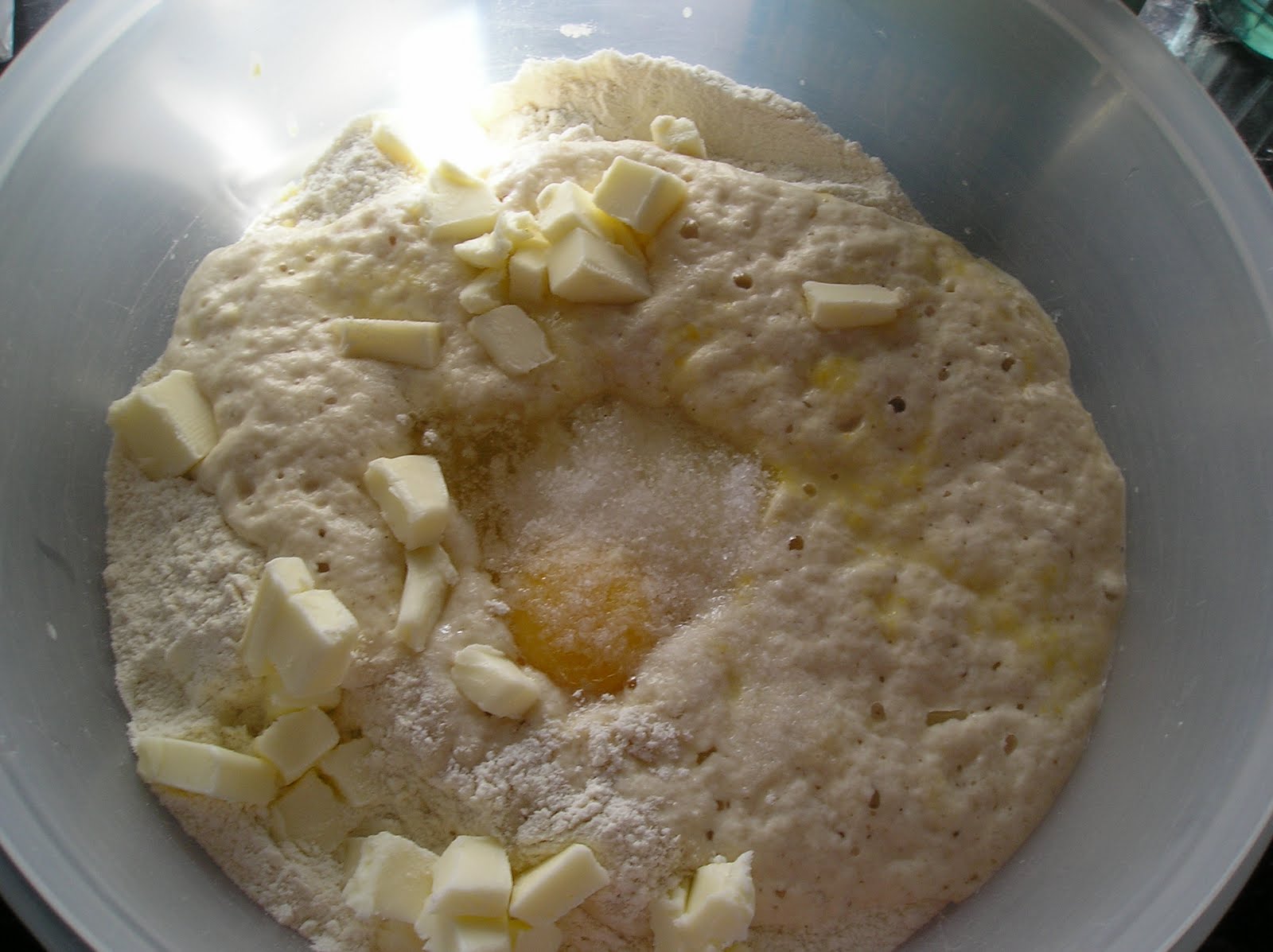 Tras esa hora inicial, la mezcla habrá espumado muy bien. Añadir el batido de maiz, el azúcar, el huevo, la sal y la mantequilla cortada en trocitos.
