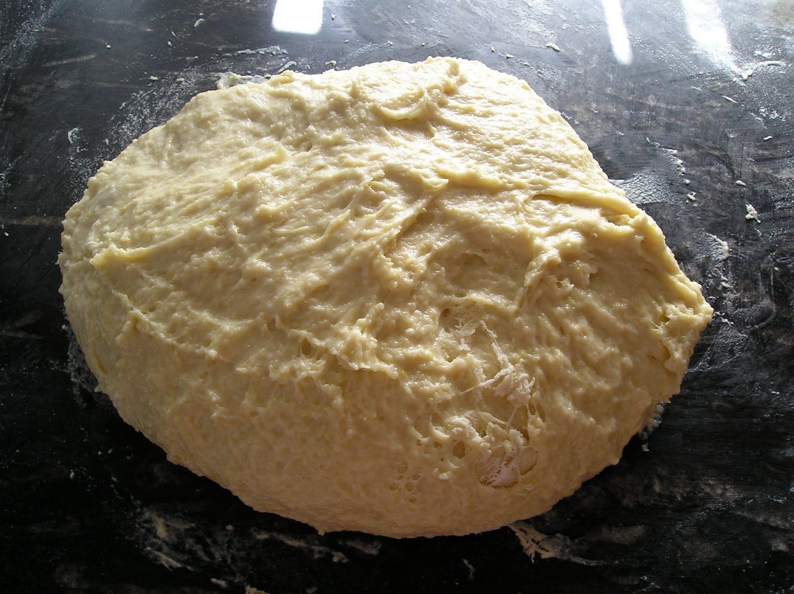 Mezclar y amasar durante diez minutos. Es una masa pegajosa. Dejar fermentar un par de horas.