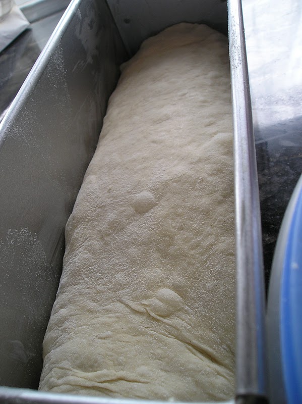 Desgasificar y amasar suavemente. Formar en rulo. Para ello partir de un rectágulo de masa y doblar en tres partes como un carta, sellando muy bien cada doblez. Al final, hacer rodar para darle una cierta tensión al rollo. Colocar en un molde de 1 kg. (si es posible de los que tiene tapa), previamente engrasado.