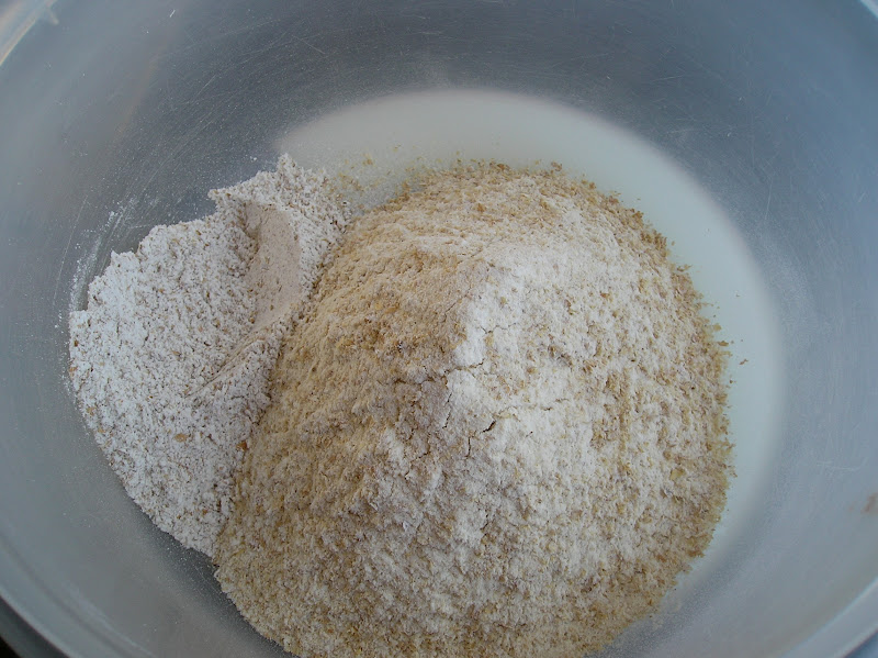 En realidad, cuando pesé los ingredientes me dí cuenta de que el paquete que tenía abierto de harina integral de trigo de El Amasadero no tenía 200 gr. Como tan sólo faltaba una pizca, lo completé con harina Allinson (que también tenía abierta). Es curioso ver la diferencia de color de una harina a otra: la harina más clara y grisácea es Allinson, la de color más tostado (y de la que hay más cantidad en el cuenco) es El Amasadero.
