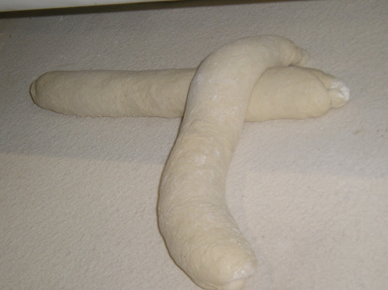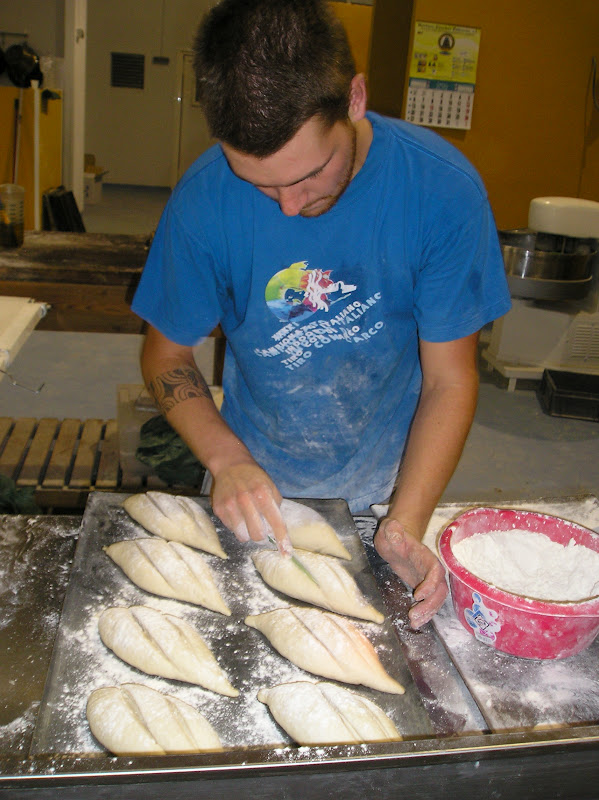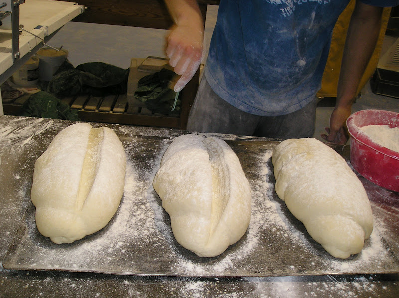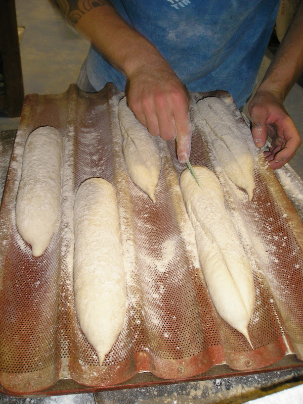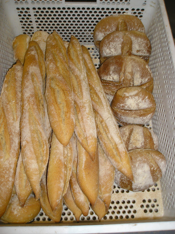 Estos panes van al horno greñados en cruz (el mayor) o con dos greñas paralelas (el menor) y que tienen este aspecto, en el cesto ya horneados, junto a las baguetes.