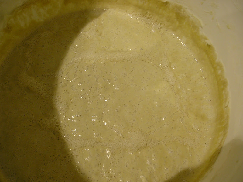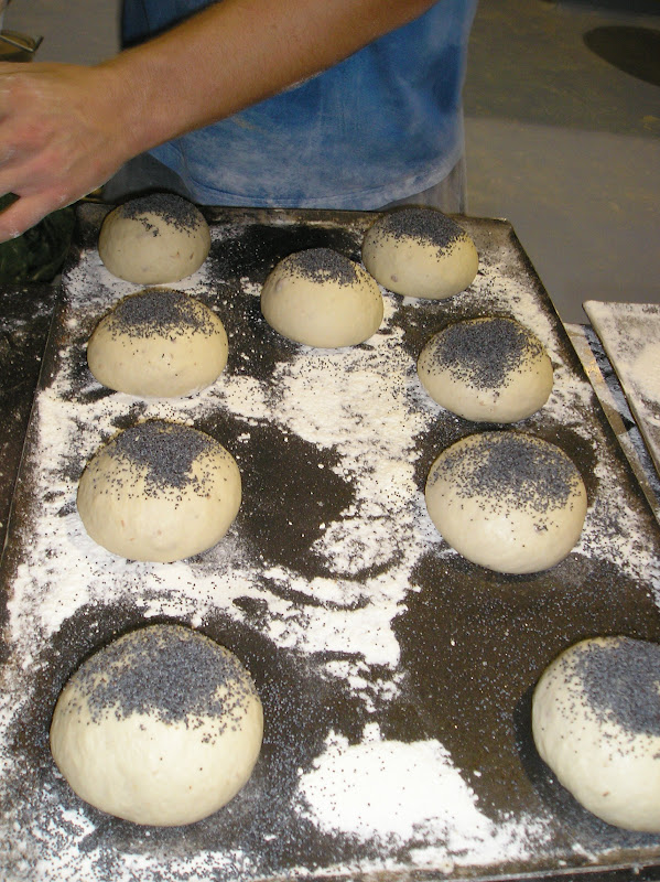Con el poolish prepara una gran masa, de la que obtiene primero baguettes y panes para bocadillo recubiertos de semillas de amapola y sésamo (de 100 gr.) . Esta es la masa, casi al final de la fermentación.