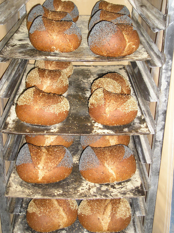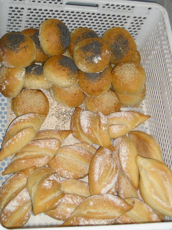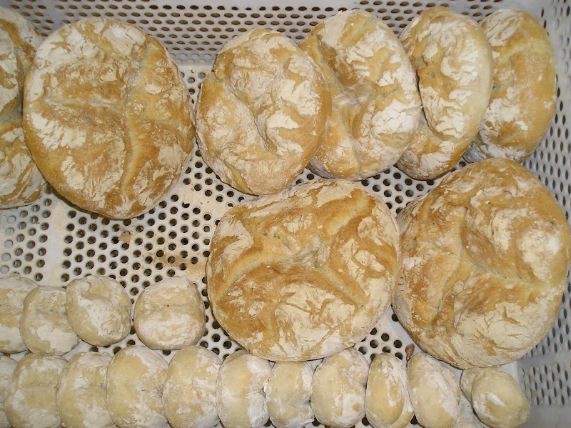 Los panes llamados payeses pesan 450 grs. forrmados en boule y luego greñados con el canto de la mano en cruz, algo que me resultó novedoso. En esta jaula se ven algunos junto a molletes pequeños.