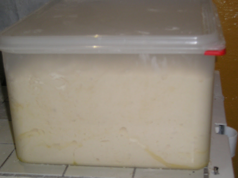 La masa madre con la que trabaja Simone me resultó sorprendente: una MM sólida al 50% de hidratación, que alimenta cada noche en una proporción de 2:1 (2 partes nuevas de harina por la parte de MM) para el día siguiente. Tras un par de horas para que las colonias de bacterias se despierten y desarrollen su trabajo inicial, la refrigera a 6º-8º hasta la noche siguiente. Este es el aspecto de la Masa Madre, recién sacada del frío y lista para comenzar a panificar con ella.