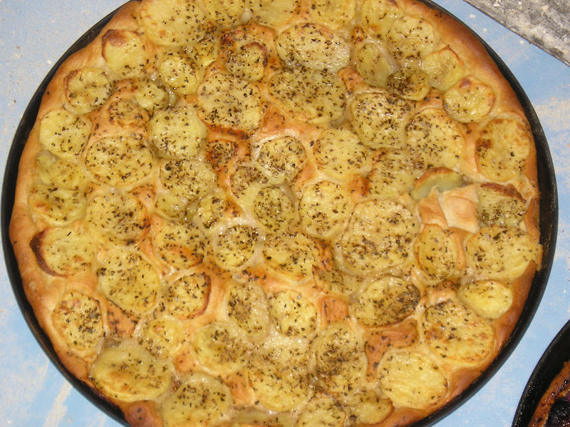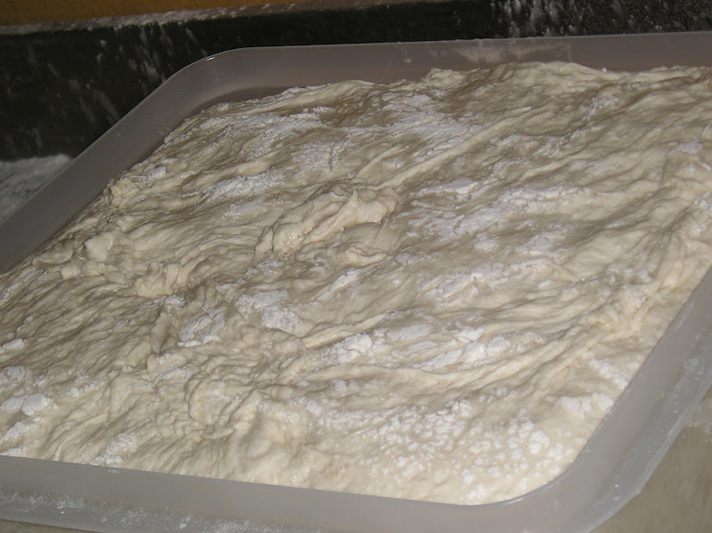 Sobre una bandeja aceitada se coloca un plastón de masa de 700 gr. que se aceita generosamente. Se estira todo lo que se piede con las puntas de los dedos, sin romper la masa. Se coloca en un ligar templado bien cubierto (un carro de bandejas forrado de lona impermeable en el obrador) y se deja reposar. Al cabo de 30-45 minutos, se vuelve a estirar lo que produce un desgasificado de la masa. Pero está muy flexible y nada tenaz, de manera que se logra fácilmente extenderla por toda la bandeja (de unos 36 cms. de diámetro). Se deja reposar y fermentar nuevamente una media hora.