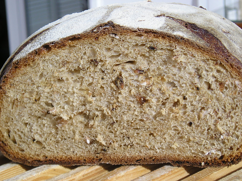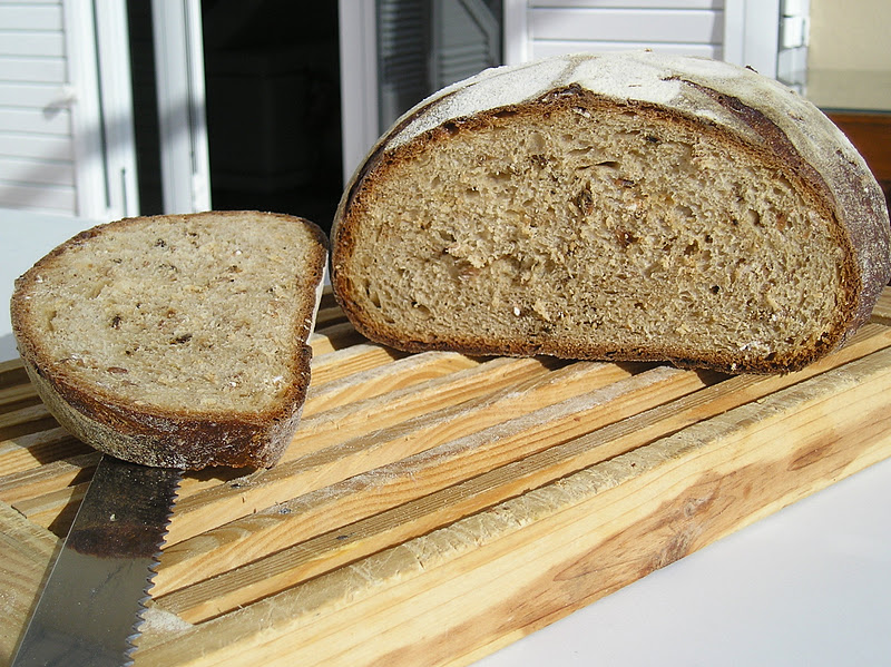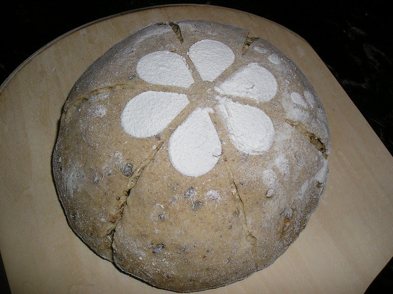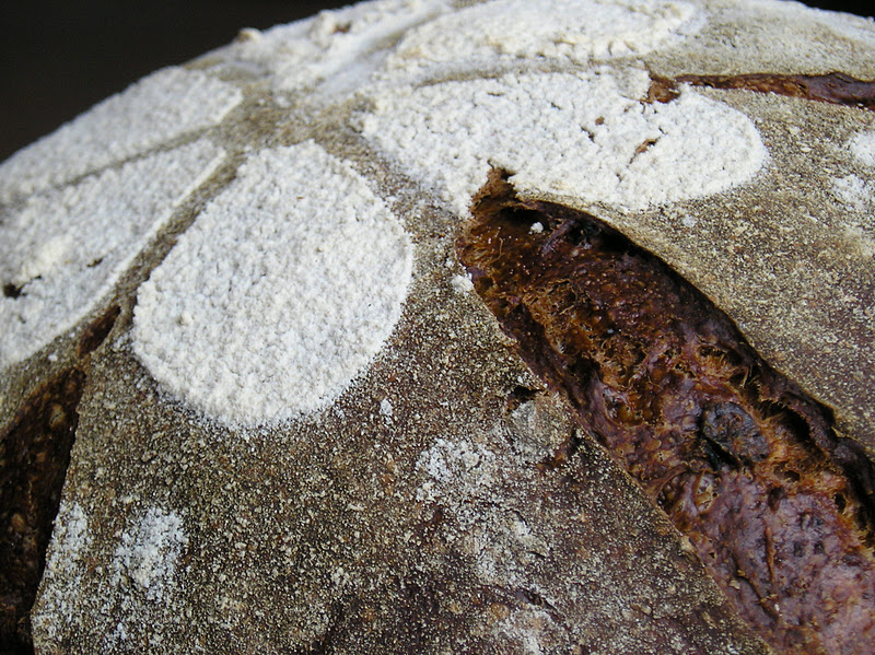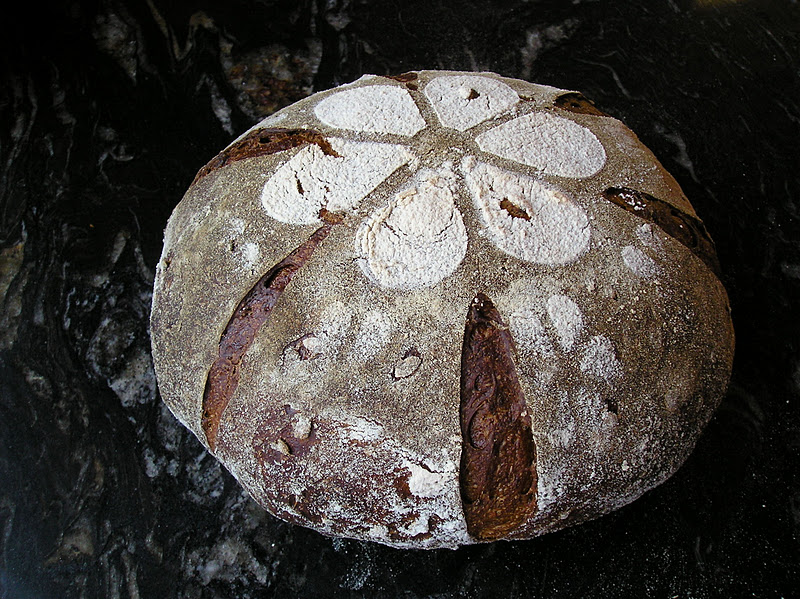El primer pan está inspirado en el hilo de El foro del Pan de cómo marcar los panes o cómo “firmar” los panes. Después de seguir este hilo, pensé que las plantillas que utilizo a veces para decorar las tartas podrían servir también para decorar los panes. Para un efecto intenso, puede añadirse un poco de malta oscura a la masa de pan, de manera que luego el contraste entre corteza y “estarcido” sea mayor. En este caso, como utilicé un resto de harina granary (por cierto, había pasado la fecha de consumo óptimo unas semanas antes, pero el resultado fue fabuloso), la masa era de por sí bastante oscura.