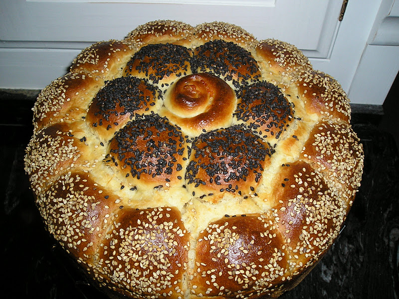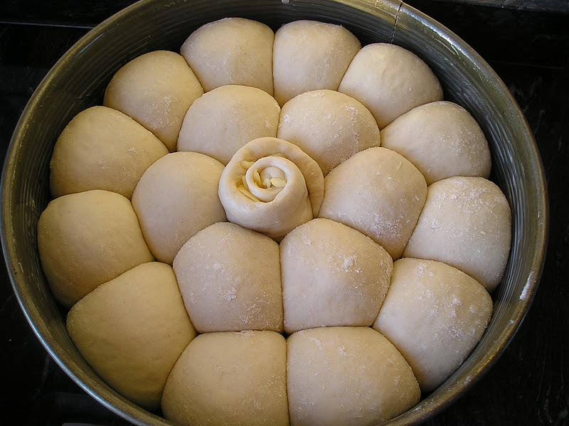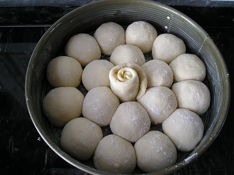 La receta la teneis ya en el blog, desde el año pasado. Con la cantidad de masa de esta receta se pueden hacer 20 bollitos de 50 gramos cada uno. EL pan redondo de la foto lleva 19 bollitos, aunque el central es algo mayor. En lugar de hacer una bola hice un rectángulo, lo espolvorée de pimentón (otras veces le pongo queso rallado) y lo enrollé sobre sí mismo, colocándolo en vertical.